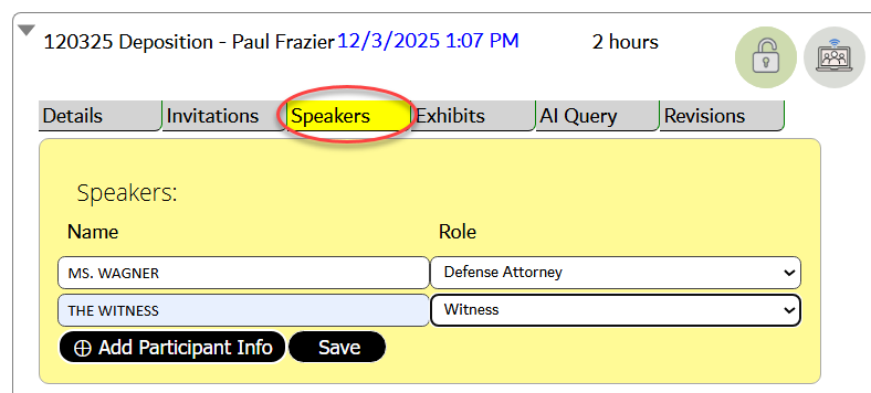 - Each speaker in the room should be labeled, and their roles should be defined. It is possible to have multiple connections, each with multiple "speakers" present.
