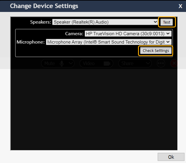 Use the Test and Check Settings buttons to test your audio and video.