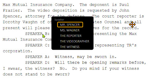 Court reporters can instantly annotate the transcript in real time on-the-fly with one-touch annotations. Annotations are very fast and easy to do. Remember, no speaker identification is needed!